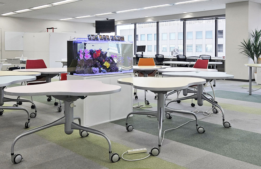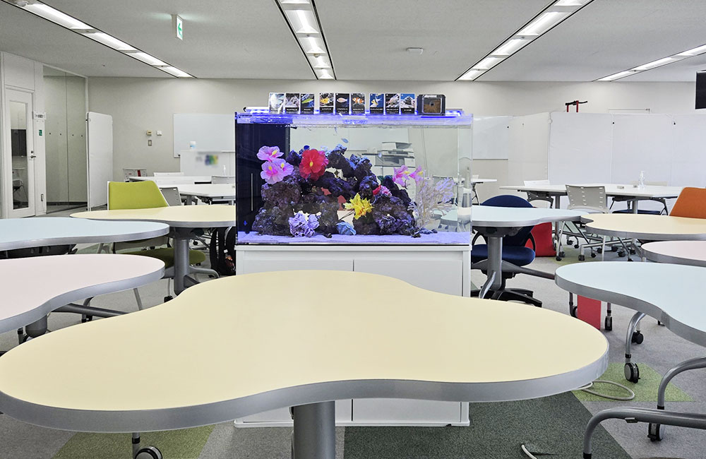 水槽内には小型海水魚をメインに導入しており、小さな海水魚たちが可愛らしく泳ぐ姿を眺めることで、リラックスムードを生み気分転換のひとときをサポートします。