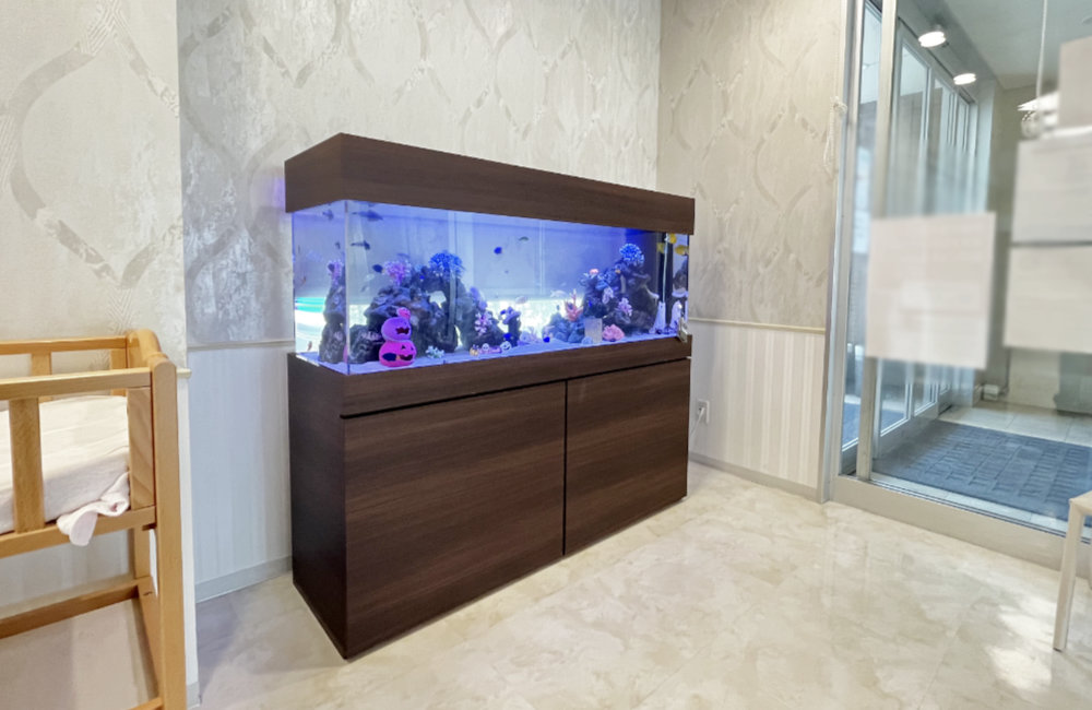 クリニック内エントランスに設置したこちらの水槽は、150cmと大型サイズで水族館のような迫力のあるマリンアクアリウムです。