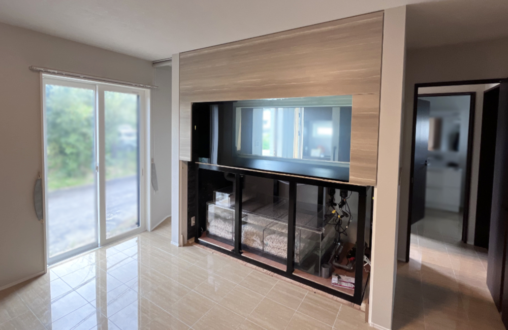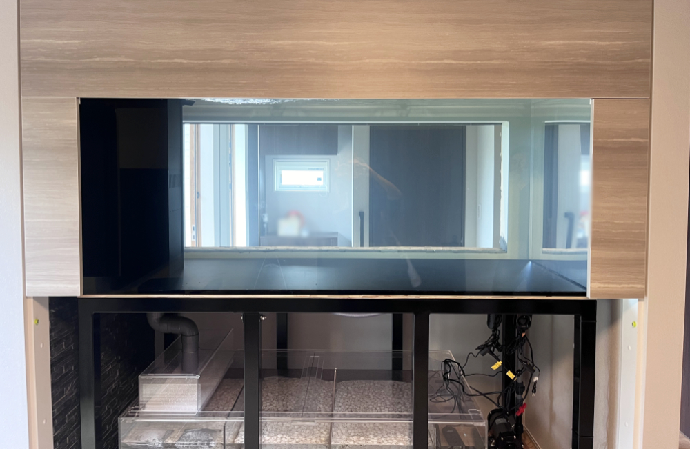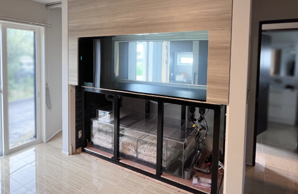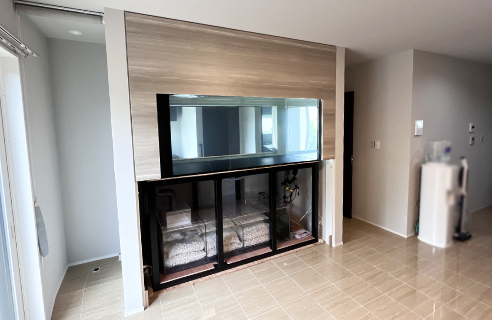 こちらの水槽は、新築住宅の設計段階でハウスメーカー様に水槽を埋め込むための空間を作っていただき、そこへ水槽をはめ込む形で設置しました。